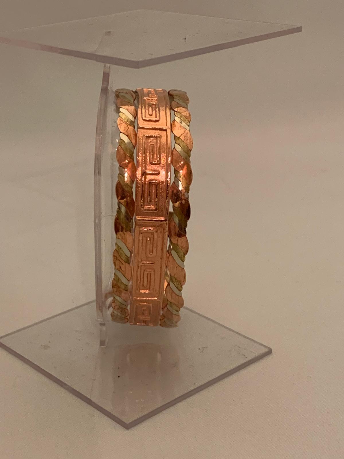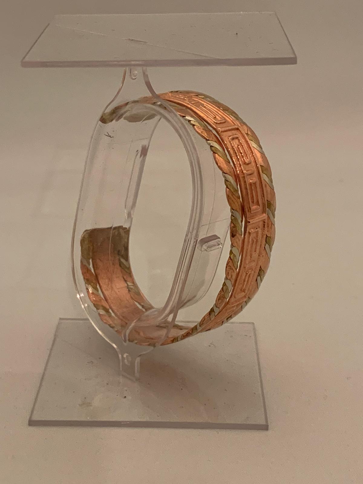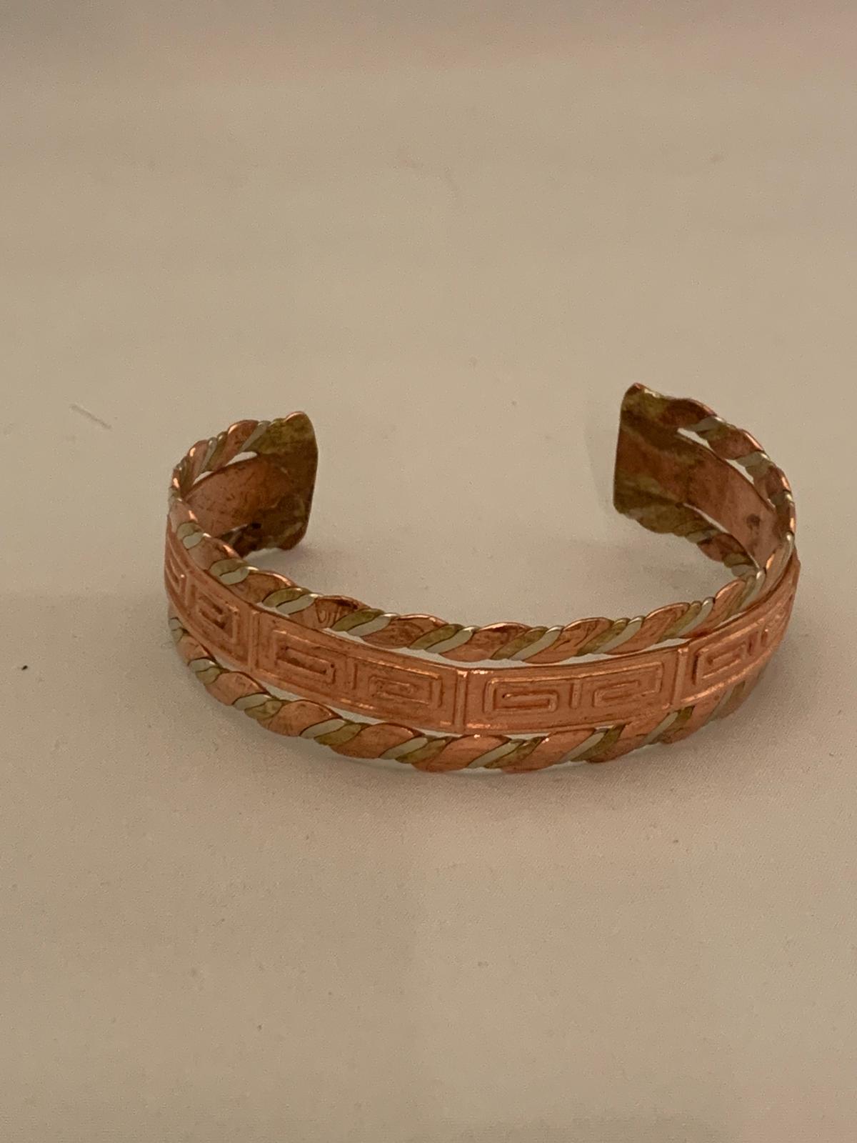 Elevate your accessory collection with this meticulously crafted copper bracelet, accented with braided brass edges for a touch of elegance. The centerpiece features intricate geometric engravings reminiscent of ancient maze patterns, symbolizing timeless artistry and precision. The combination of warm copper and golden brass creates a harmonious balance, reflecting both rustic charm and refined craftsmanship. Designed with care by the skilled artisan at Metalix by Minerva, this piece is a testament to quality and elegance, making it a standout addition to any ensemble.