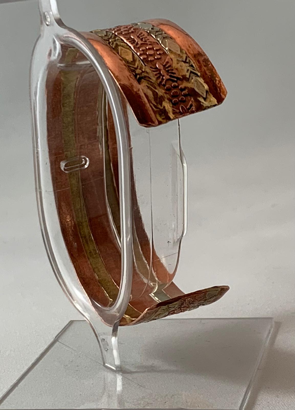 This copper cuff showcases vibrant floral nature-inspired and geometric patterns in copper and brass. Its layered textures and high-polish finish make it a standout piece for any jewellery collection.