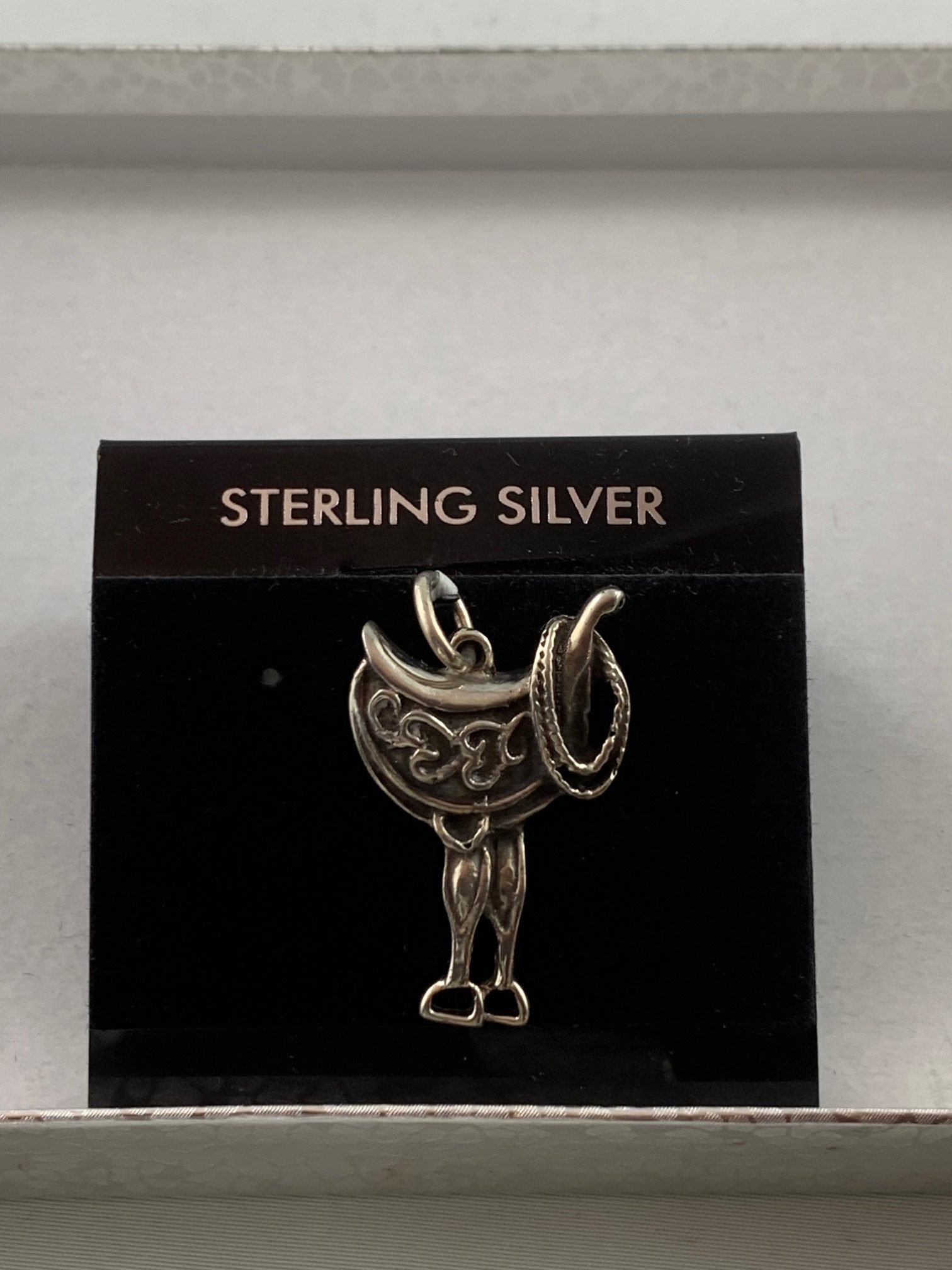 A charming sterling silver saddle Pendant, capturing the spirit of equestrian tradition. Featuring fine engravings and a dangling stirrup, this piece is a must-have for horse lovers and riders.