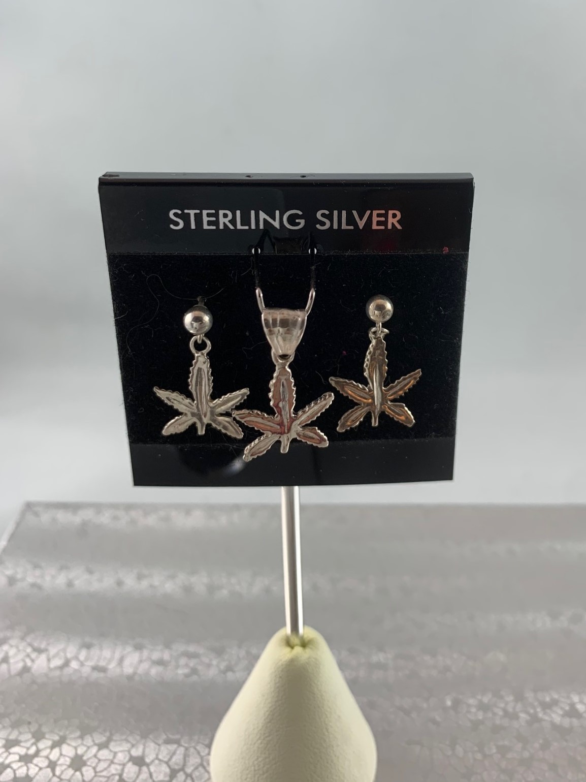 A set of sterling silver Marijuana leaf pendant and earings. A bold statement piece with exquisite detailing.