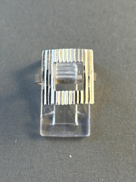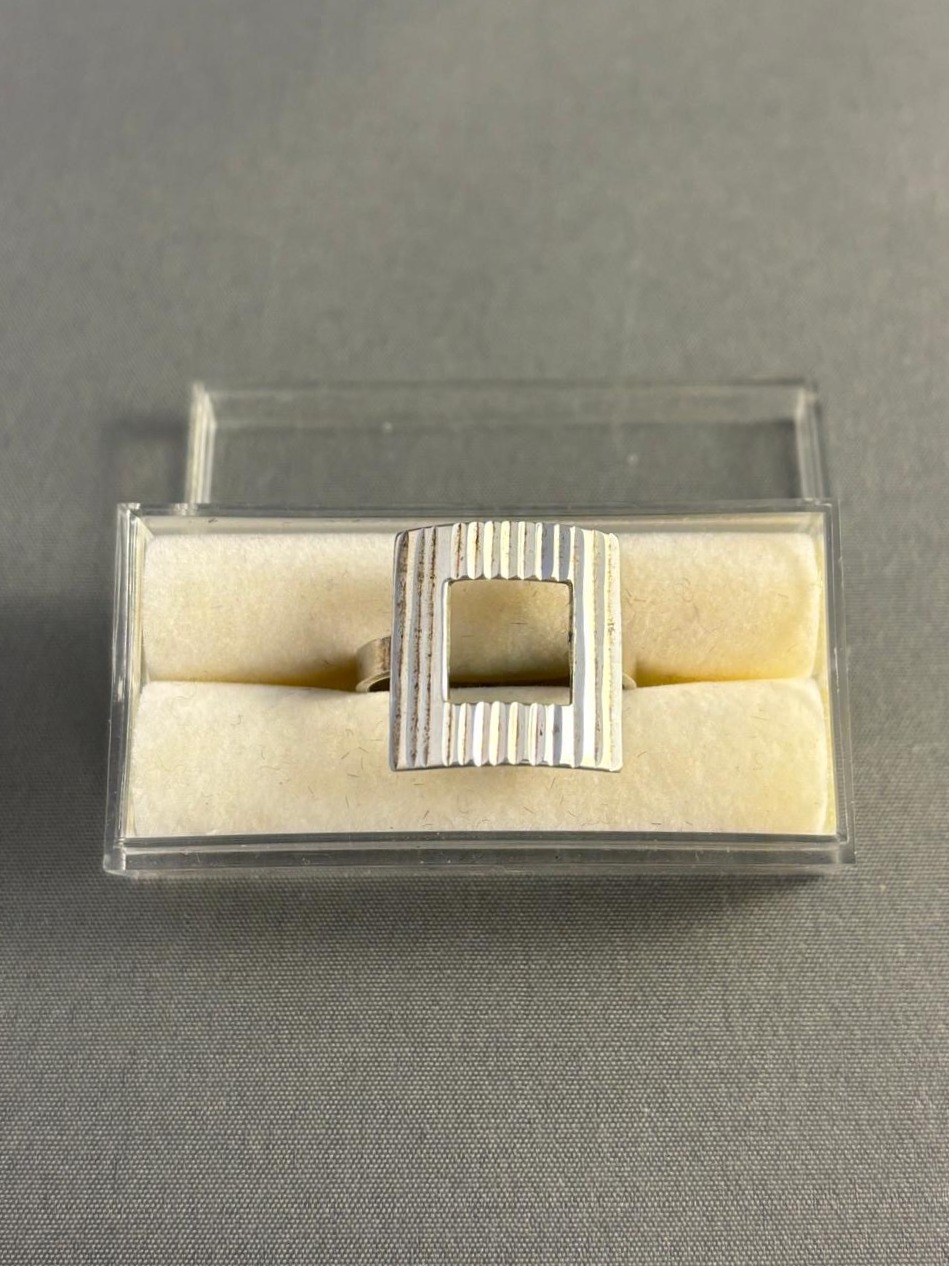 This contemporary silver ring features a striking open square design with ridged edges, creating a bold yet minimalist aesthetic. Crafted from quality silver, this ring embodies both modernity and timeless elegance. Its clean diamond cut geometric lines make it a versatile piece that complements any outfit, from casual to formal.