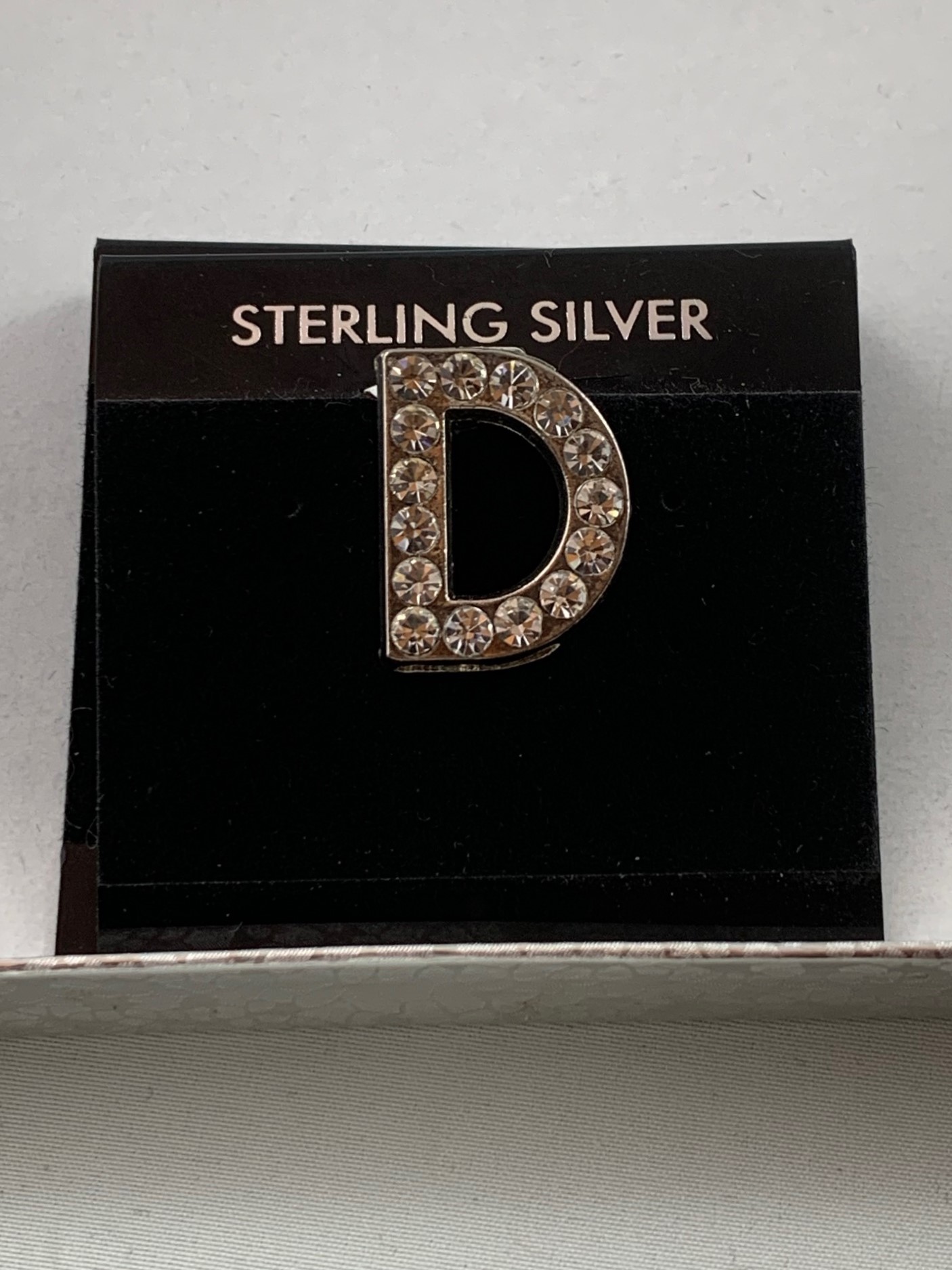 A dazzling sterling silver charm in the shape of the letter ‘D,’ encrusted with shimmering crystals. A beautiful and personalized way to celebrate identity and elegance.