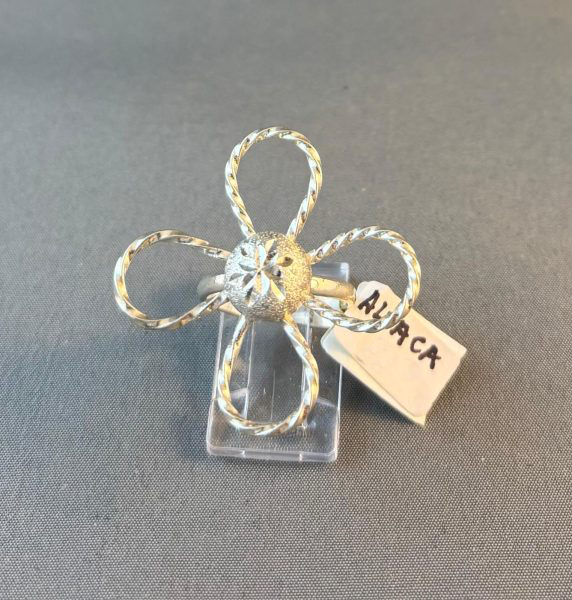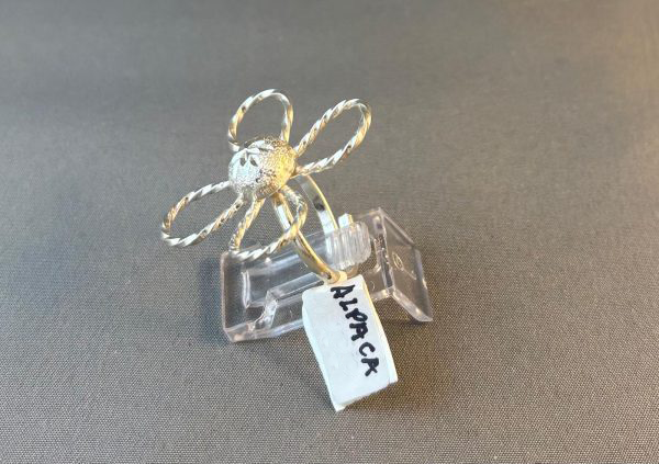 | This exquisite silver-plated alpaca ring showcases a beautifully crafted flower design. The textured floral centerpiece is accented with delicately twisted loops, creating a timeless and elegant piece. Perfect for those who appreciate artisanal craftsmanship and unique statement jewellery. Add this stunning ring to your collection or gift it to someone special. |