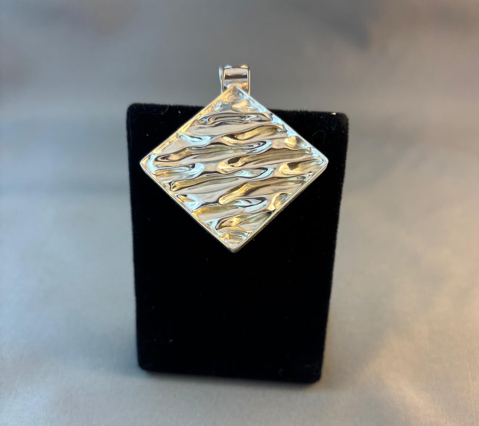 | Featuring a modern diamond-shaped design, this pendant is brought to life by its shimmering, textured surface. Made from durable alpaca and plated with silver, it combines contemporary aesthetics with artisan quality, perfect for elevating your everyday style. |