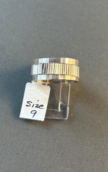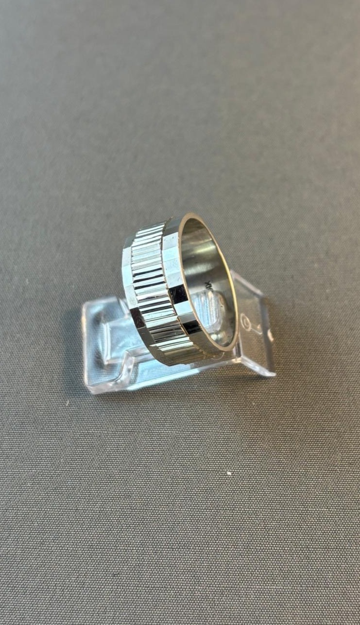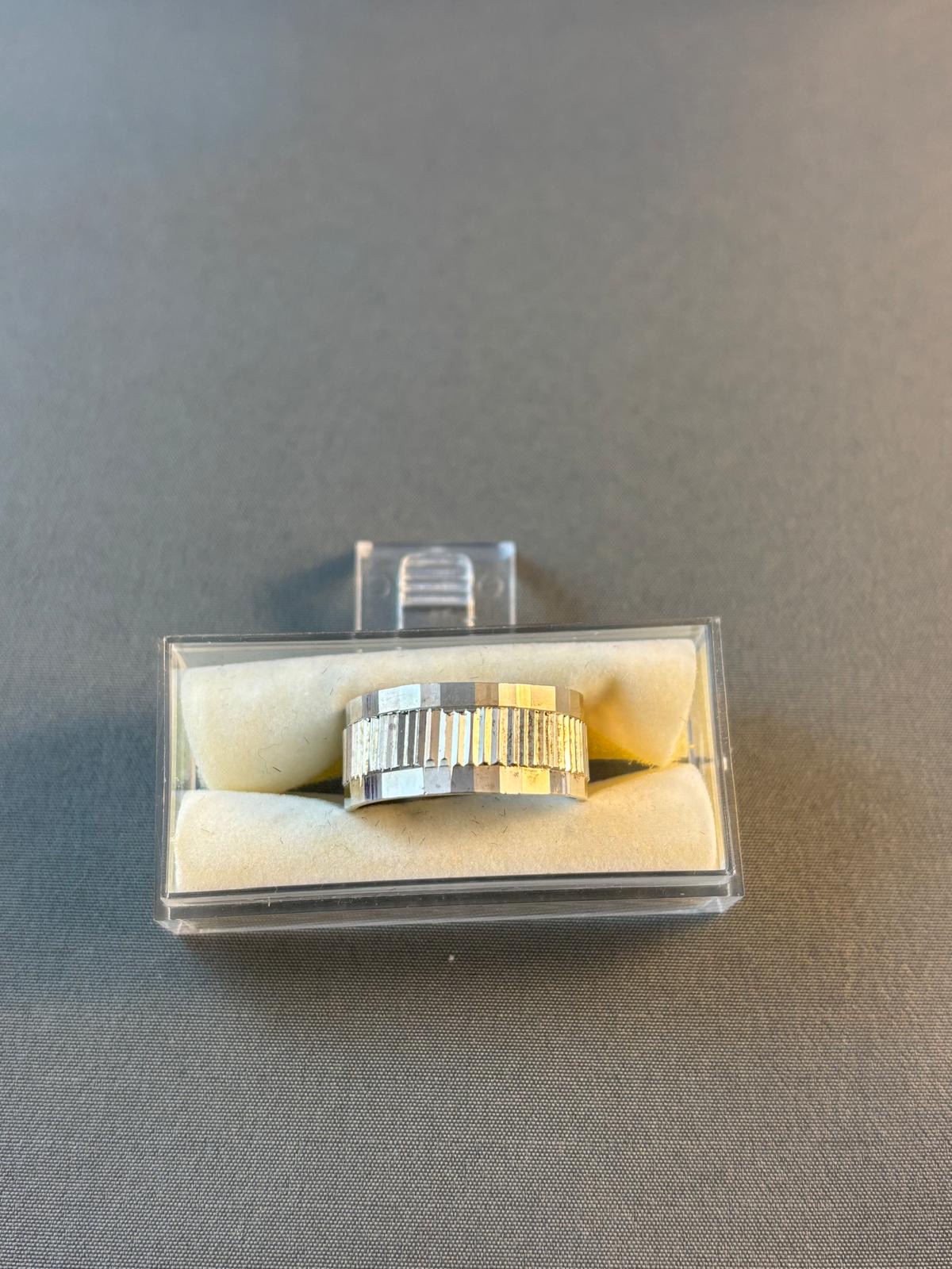 A sleek silver band with a refined textured diamond cut finish, this ring is a contemporary take on a classic accessory. Its structured design adds a subtle yet sophisticated touch, making it an excellent choice for daily wear or special occasions. Crafted with quality and care, it’s a staple for any jewellery lovers