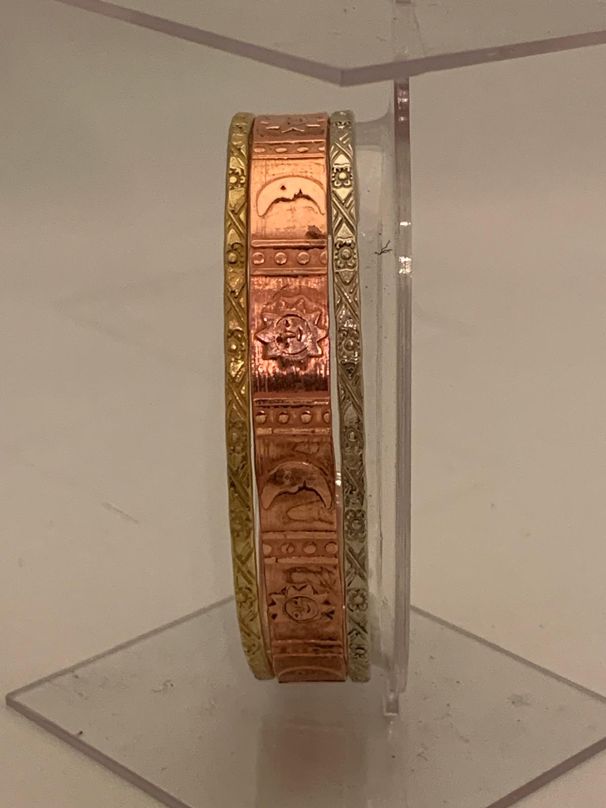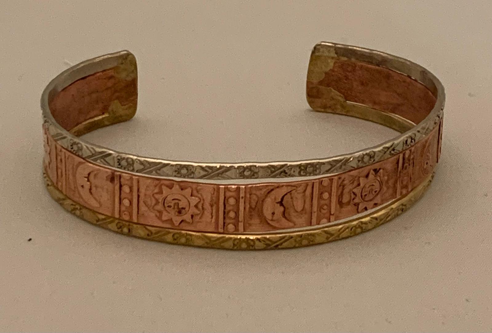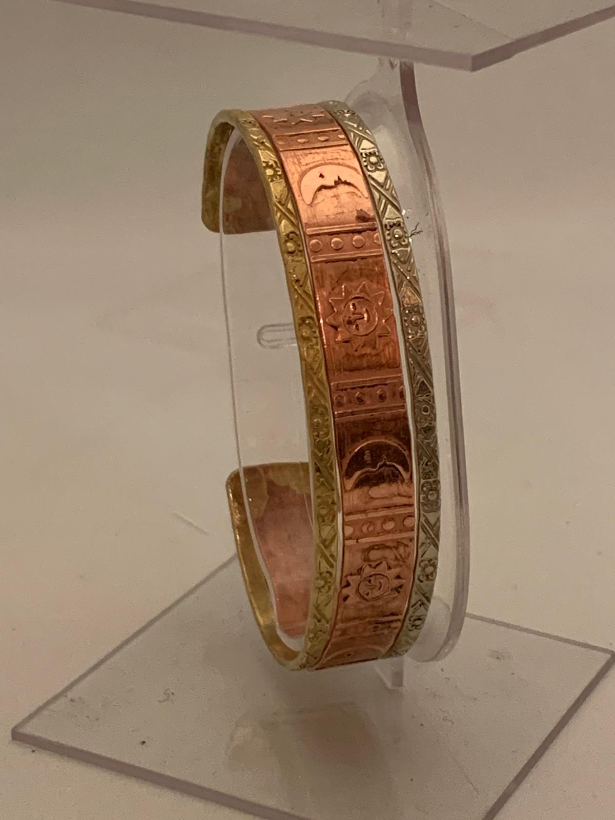 This handcrafted copper and brass cuff bracelet features a thick copper brand engraved with intricate sun and moon motifs, nestled between two thin brass bands forming a rich and timeless design. This bracelet is versatile and makes a perfect accessory for any occasion. Celebrate artistry and elegance with Metalix by Minerva.